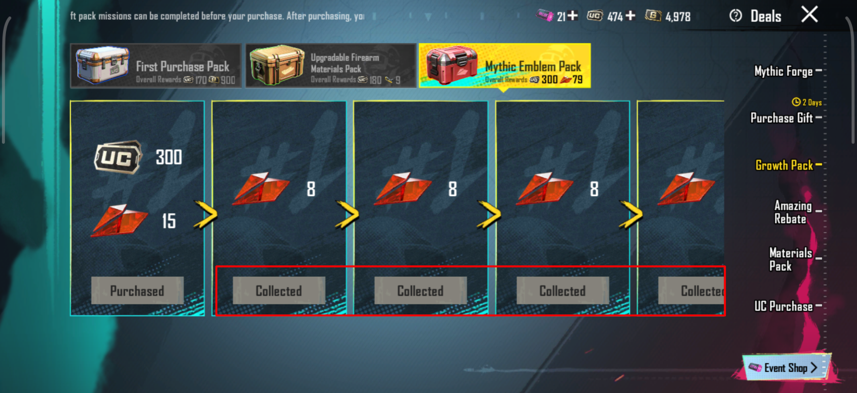 Each pack available in the Growth Pack section is purchasable only once. If you have purchased a pack in the past, it will be sold out and you will need to complete the login missions to collect the remaining rewards within a pack. This still applies if you have purchased the same pack a year ago.