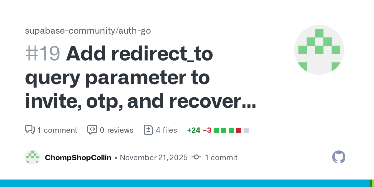 Hi, I have been making use of the community golang client library in my web application. However, I noticed that there were some missing features: redirect parameters and the resend invitation route. So I went ahead and made a couple PRs to add them: https://github.com/supabase-community/auth-go/pull/19 and https://github.com/supabase-community/auth-go/pull/21. Support recommended that I post in the discord to draw some attention to them so here I am! Any help in getting these merged would be much appreciated!