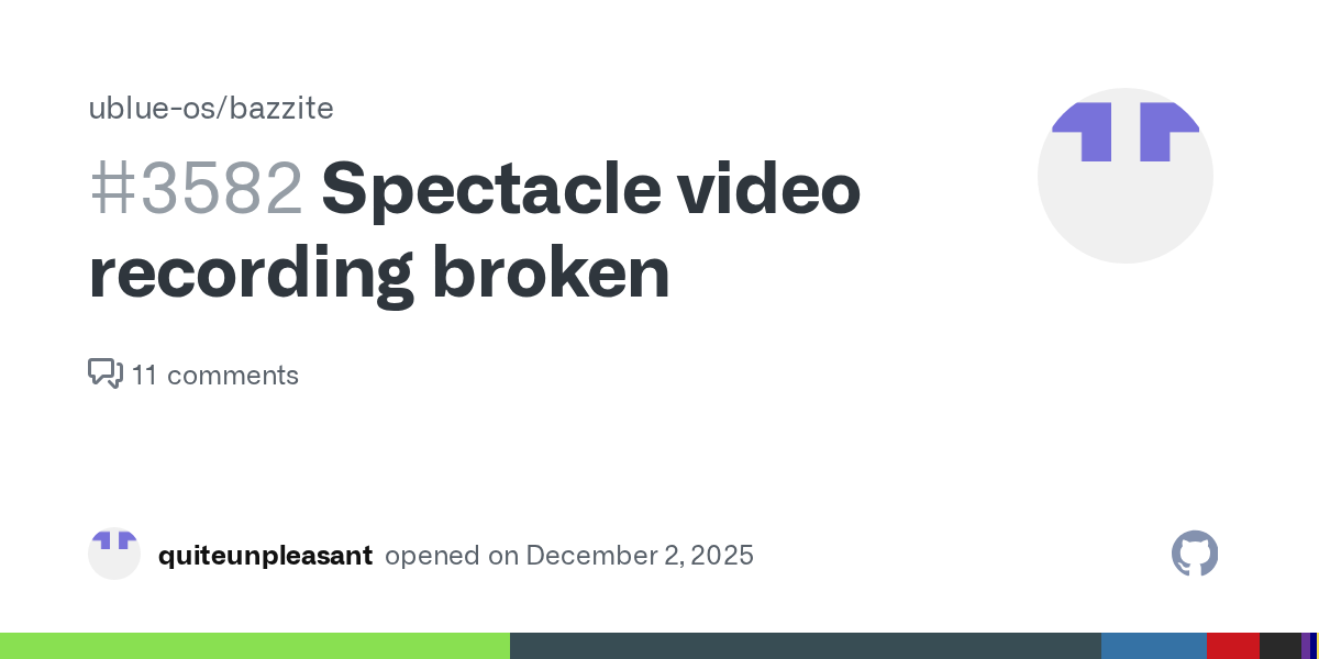 Describe the bug Hello. Spectacle screen recording seems to be broken on recent Bazzite updates (Nvida - KDE). After supposedly recording it will ouput only a 297 byte empty file (every time) or a ...