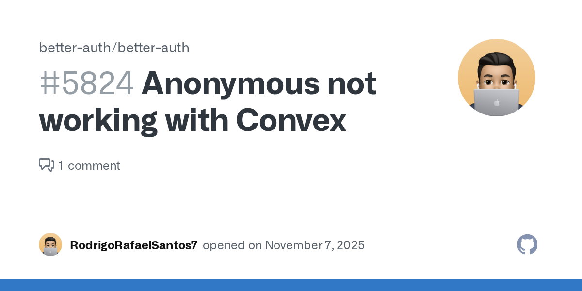 Is this suited for github? Yes, this is suited for github To Reproduce Reproduction Steps Enable the anonymous plugin: betterAuth({ plugins: [ anonymous({ emailDomainName: 'localhost:3000' ...