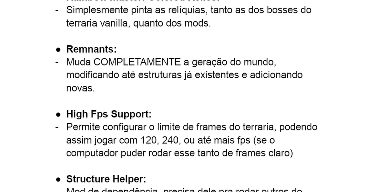 Descrição breve do que faz cada mod: Rainbow master: Colored Relics: Simplesmente pinta as relíquias, tanto as dos bosses do terraria vanilla, quanto dos mods. Remnants: Muda COMPLETAMENTE a geração do mundo, modificando até estruturas já existentes e adicionando novas. High Fps Support: Perm...