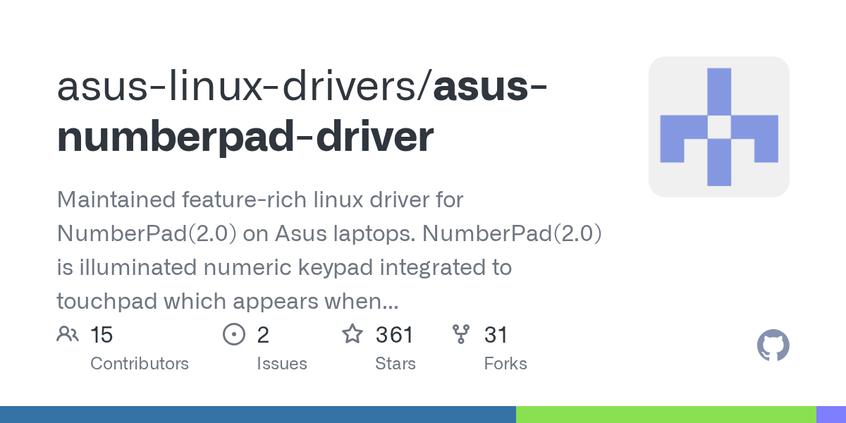 Maintained feature-rich linux driver for NumberPad(2.0) on Asus laptops. NumberPad(2.0) is illuminated numeric keypad integrated to touchpad which appears when is done tap on top right corner of to...