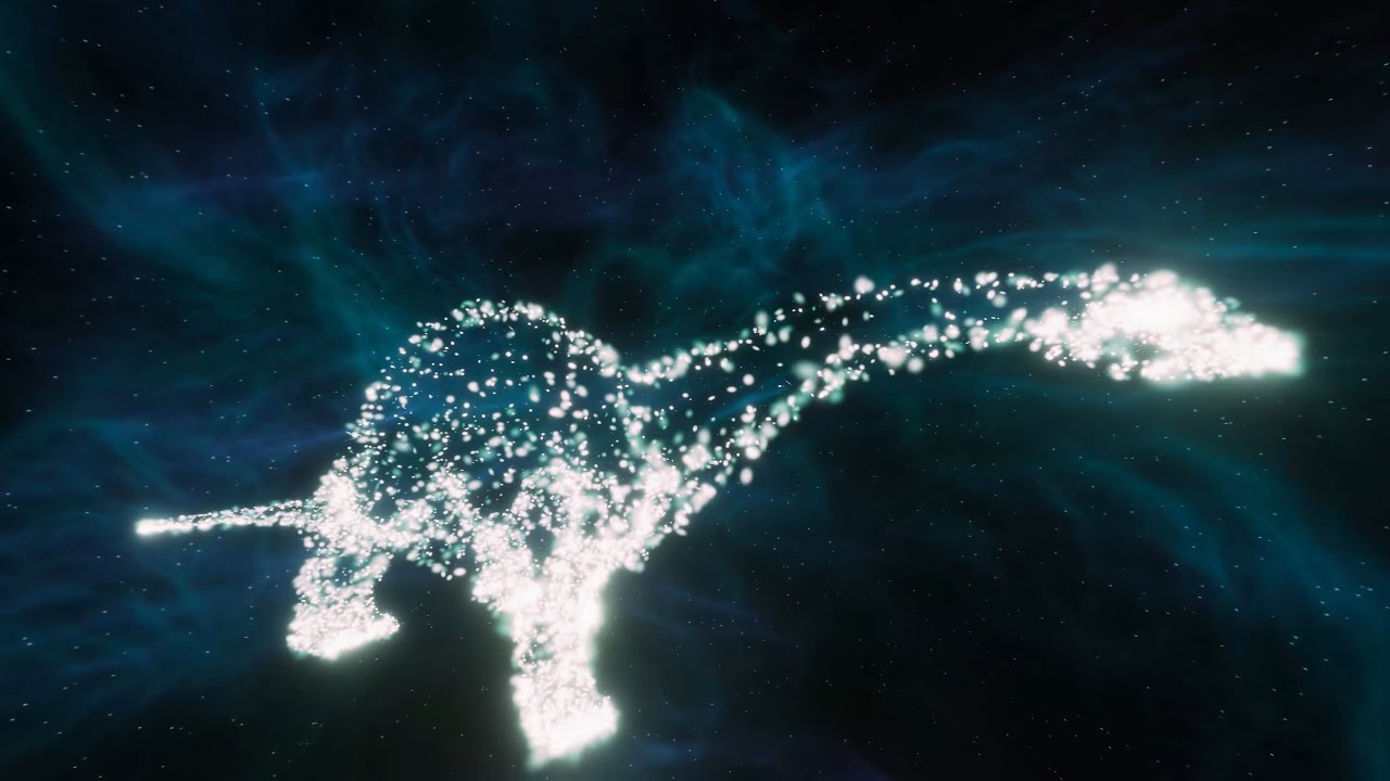 Content: Transformation of particles in the shape of elephant, dinosaur, bee, dragon